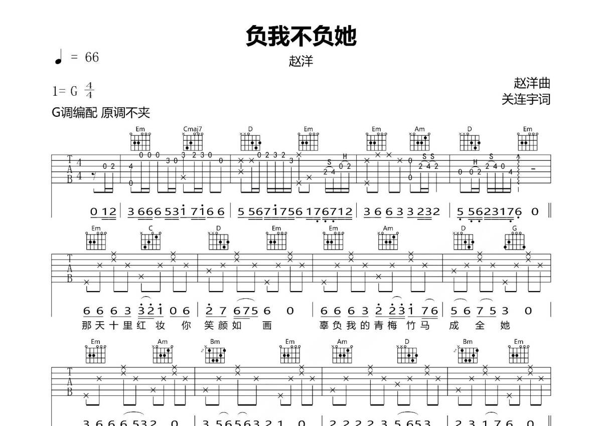 赵洋《负我不负她》吉他谱 - G调弹唱六线谱