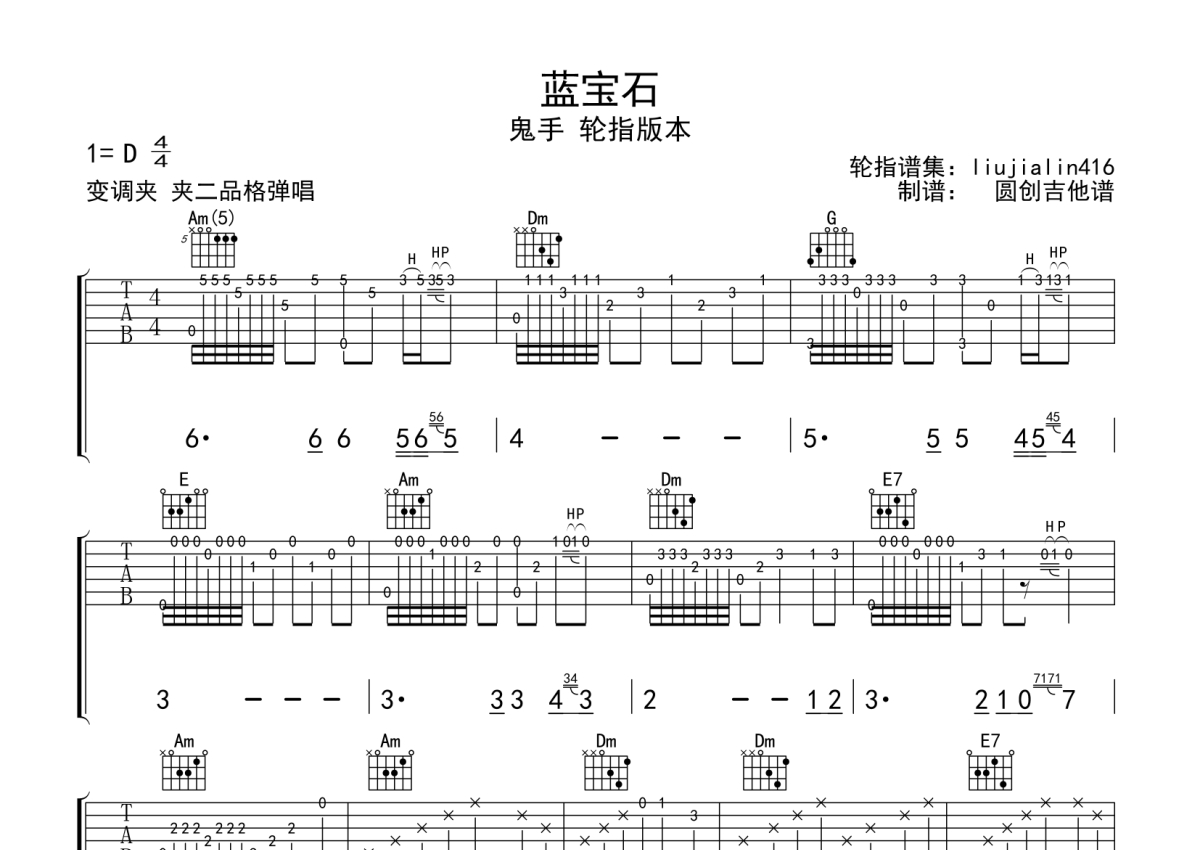 《蓝宝石》是鬼手演唱的一首歌曲,拍号为4/4拍,歌曲原调为D调,但由于原调指法比较难,为了方便弹奏,本吉他谱采用的是D调指法编配,变调夹2品弹奏即为原调,当然也可以根据自己的音域改变变调夹位置,或者通过改变和弦调性,以方便自己弹奏,这份吉他谱共有三张高清图谱,图谱由 @圆创吉他谱 编配上传,图谱使用六线谱编配,包含吉他和弦指法、简谱以及歌词部分,曲谱配备了相关的视频提供浏览,使用这份蓝宝石吉他谱,可以让你更加方便地掌握这首歌曲的弹唱技巧,快来尝试吧。