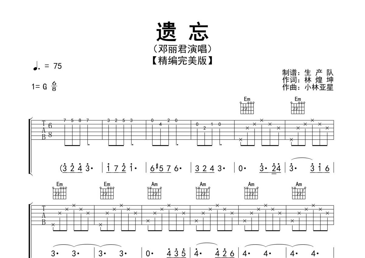 《遗忘》是邓丽君演唱的一首歌曲,精编完美版,拍号为6/8拍,歌曲速度为每分钟75拍,歌曲原调为G调,本吉他谱采用的是G调指法编配,演奏时不需要使用变调夹即为原调,这份吉他谱共有三张高清图谱,图谱由 @生产队 编配上传,图谱使用六线谱编配,包含吉他和弦指法、简谱以及歌词部分,使用这份遗忘吉他谱,可以让你更加方便地掌握这首歌曲的弹唱技巧,快来尝试吧。《遗忘》是歌手邓丽君演唱的一首歌曲,这首歌曲首次原先在1979年9月20日收录在专辑《难忘的一天》中于台湾等地发行,同年11月15日收录在专辑《甜蜜蜜》中于香港等地发行。本吉他谱根据G调指法编配,精准的前奏、间奏、尾奏及SOLO编配,值得推荐的经典歌曲!。