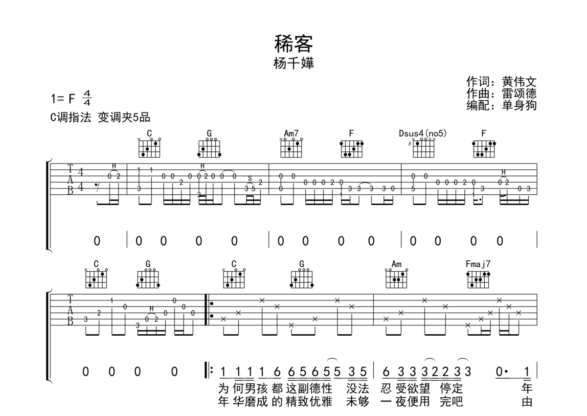 《稀客》是杨千嬅演唱的一首歌曲,拍号为4/4拍,歌曲原调为F调,但由于原调指法比较难,为了方便弹奏,本吉他谱采用的是C调指法编配,变调夹5品弹奏即为原调,当然也可以根据自己的音域改变变调夹位置,或者通过改变和弦调性,以方便自己弹奏,这份吉他谱共有三张高清图谱,图谱由 @单身狗 编配上传,图谱使用六线谱编配,包含吉他和弦指法、简谱以及歌词部分,使用这份稀客吉他谱,可以让你更加方便地掌握这首歌曲的弹唱技巧,快来尝试吧。