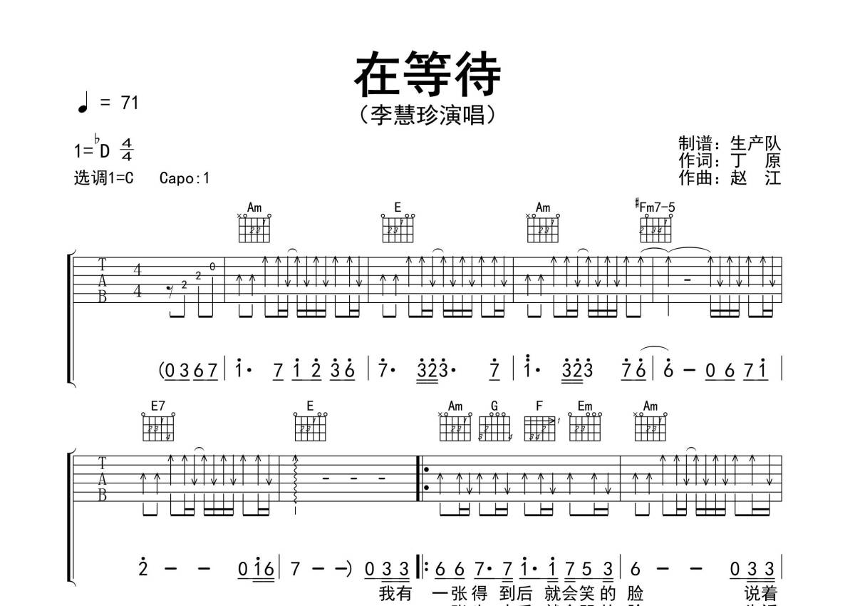 《在等待》是李慧珍演唱的一首歌曲,精编扫弦版,拍号为4/4拍,歌曲速度为每分钟71拍,歌曲原调为Db调,但由于原调指法比较难,为了方便弹奏,本吉他谱采用的是C调指法编配,变调夹1品弹奏即为原调,当然也可以根据自己的音域改变变调夹位置,或者通过改变和弦调性,以方便自己弹奏,这份吉他谱共有三张高清图谱,图谱由 @生产队 编配上传,图谱使用六线谱编配,包含吉他和弦指法、简谱以及歌词部分,使用这份在等待吉他谱,可以让你更加方便地掌握这首歌曲的弹唱技巧,快来尝试吧。《在等待》是李慧珍演唱的一首经典歌曲,歌曲《在等待》获“中国歌曲总评榜”1997年第一季度12期十大金曲和第5届东方风云榜“东方新人奖”。本吉他谱根据原版采用C调指法编配的扫弦版,完整的前奏、间奏、尾奏,更加适合吉他弹唱,效果非常棒,值得推荐的怀旧歌曲!。