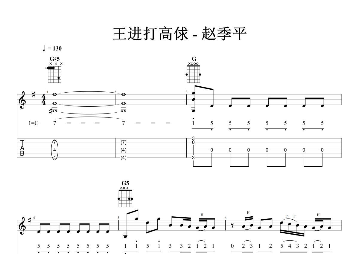 《水浒传王进打高俅》是赵季平演唱的一首歌曲,石头音乐原版记谱,拍号为4/4拍,歌曲速度为每分钟130拍,歌曲原调为G调,本吉他谱采用的是G调指法编配,演奏时不需要使用变调夹即为原调,这份吉他谱共有四张高清图谱,图谱由 @石头音乐 编配上传,图谱使用六线谱编配,曲谱配备了相关的音频提供试听,使用这份水浒传王进打高俅吉他谱,可以让你更加方便地掌握这首歌曲的演奏技巧,快来尝试吧。