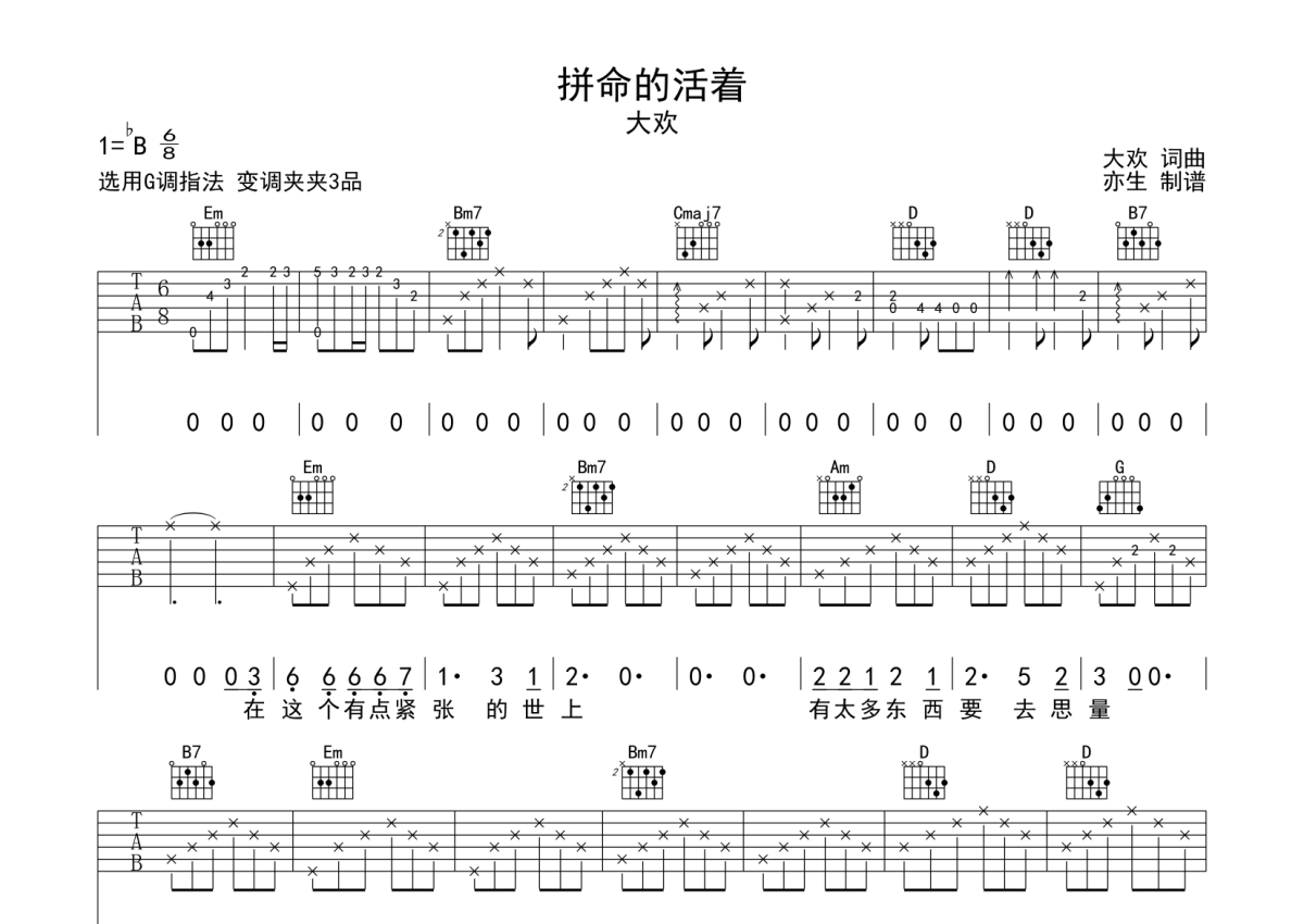 大欢《拼命的活着》吉他谱 - G调弹唱六线谱