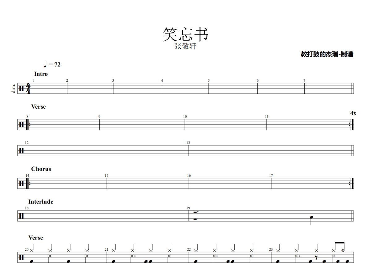 张敬轩《笑忘书》鼓谱 - 架子鼓谱