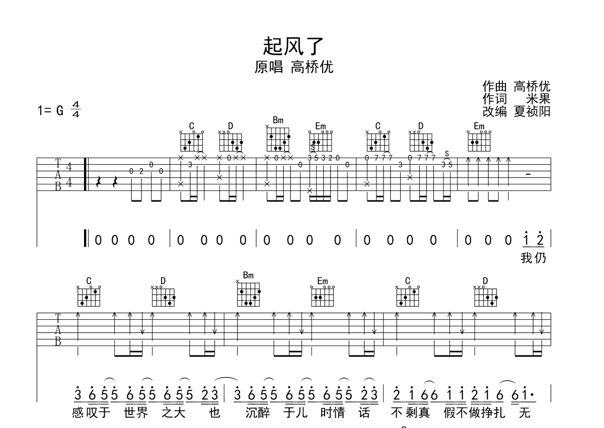 高桥优《起风了》吉他谱 - G调弹唱六线谱