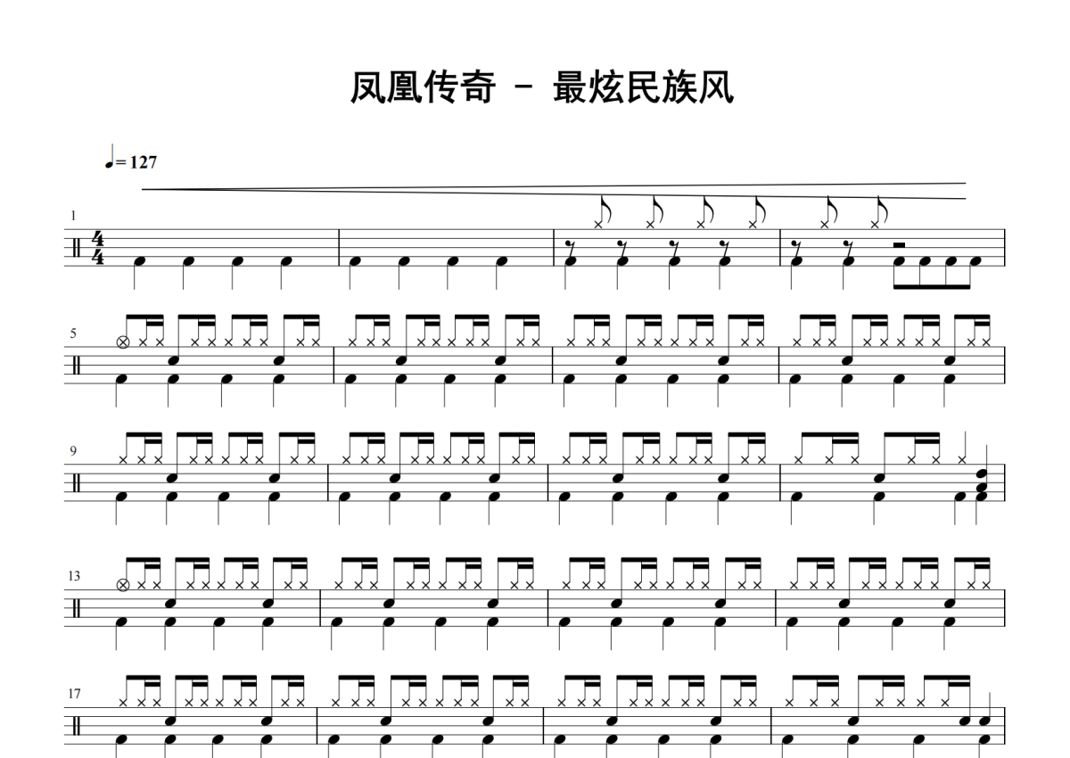 《最炫民族风》是凤凰传奇演唱的一首歌曲,拍号为4/4拍,歌曲速度为每分钟127拍,这份鼓谱共有四张高清图谱,图谱由 @老虎不说谎 编配上传,图谱使用五线谱编配,使用这份最炫民族风架子鼓谱,你将能够轻松地敲打出这首凤凰传奇的最炫民族风,快来尝试吧。