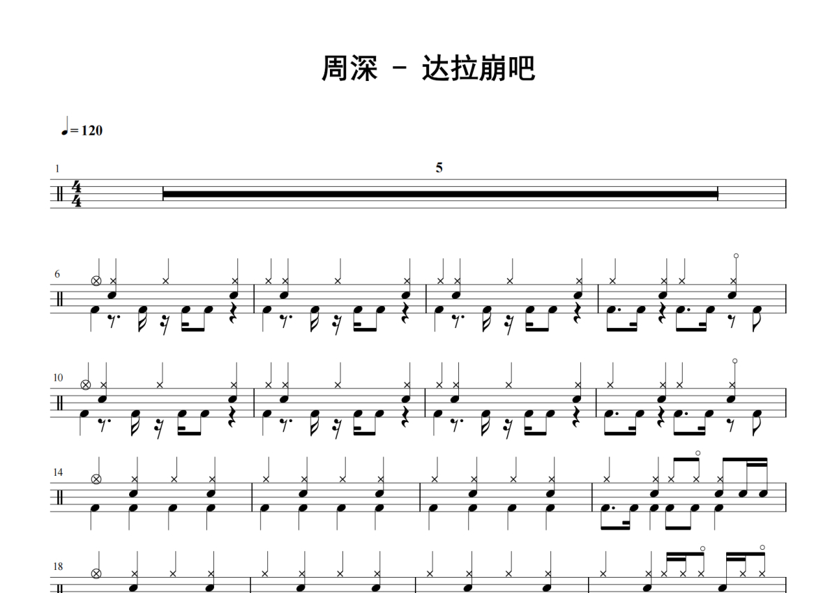 《达拉崩吧》是周深演唱的一首歌曲,拍号为4/4拍,歌曲速度为每分钟120拍,这份鼓谱共有四张高清图谱,图谱由 @老虎不说谎 编配上传,图谱使用五线谱编配,使用这份达拉崩吧架子鼓谱,你将能够轻松地敲打出这首周深的达拉崩吧,快来尝试吧。