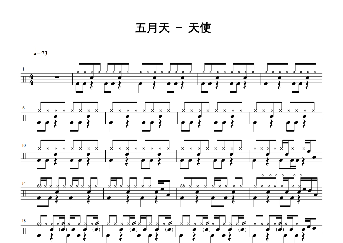 《天使》是五月天演唱的一首歌曲,拍号为4/4拍,歌曲速度为每分钟73拍,这份鼓谱共有两张高清图谱,图谱由 @老虎不说谎 编配上传,图谱使用五线谱编配,使用这份天使架子鼓谱,你将能够轻松地敲打出这首五月天的天使,快来尝试吧。