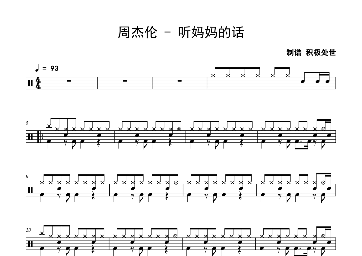 《听妈妈的话》是周杰伦演唱的一首歌曲,歌曲速度为每分钟93拍,这份鼓谱共有两张高清图谱,图谱由 @老虎不说谎 编配上传,图谱使用五线谱编配,使用这份听妈妈的话架子鼓谱,你将能够轻松地敲打出这首周杰伦的听妈妈的话,快来尝试吧。