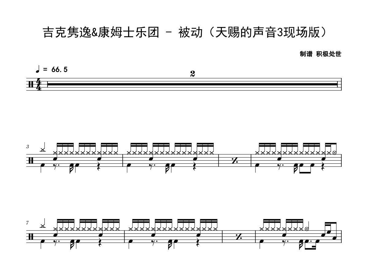 《被动》是吉克隽逸/康姆士乐团演唱的一首歌曲,天赐的声音3现场版,拍号为4/4拍,歌曲速度为每分钟66拍,这份鼓谱共有三张高清图谱,图谱由 @老虎不说谎 编配上传,图谱使用五线谱编配,使用这份被动架子鼓谱,你将能够轻松地敲打出这首吉克隽逸/康姆士乐团的被动,快来尝试吧。