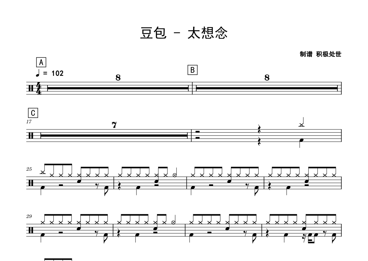 《太想念》是豆包演唱的一首歌曲,拍号为4/4拍,歌曲速度为每分钟102拍,这份鼓谱共有两张高清图谱,图谱由 @老虎不说谎 编配上传,图谱使用五线谱编配,使用这份太想念架子鼓谱,你将能够轻松地敲打出这首豆包的太想念,快来尝试吧。