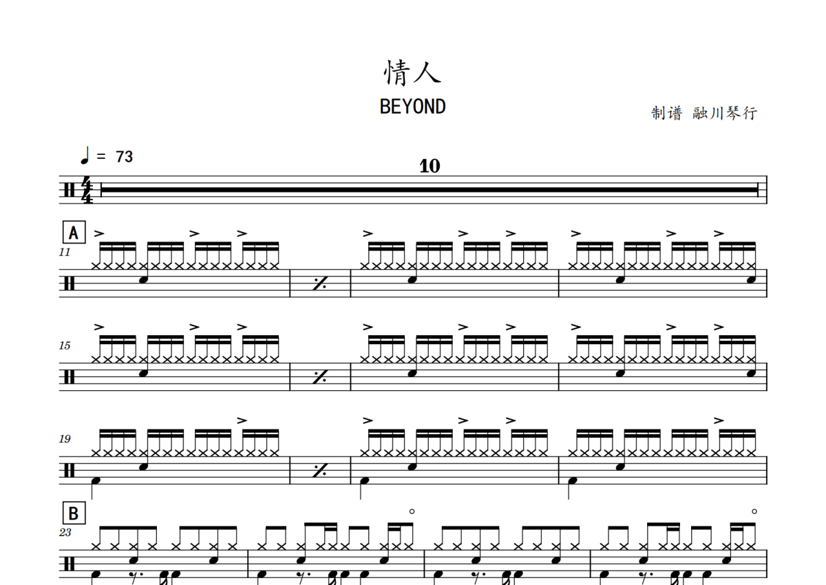 《情人》是Beyond演唱的一首歌曲,拍号为4/4拍,歌曲速度为每分钟73拍,这份鼓谱共有两张高清图谱,图谱由 @老虎不说谎 编配上传,图谱使用五线谱编配,使用这份情人架子鼓谱,你将能够轻松地敲打出这首Beyond的情人,快来尝试吧。