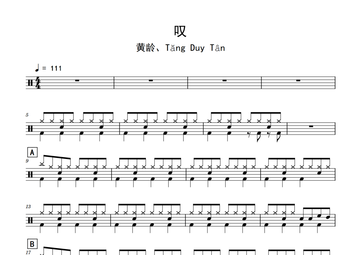 《叹》是黄龄/ Tang Duy Tan演唱的一首歌曲,拍号为4/4拍,歌曲速度为每分钟111拍,这份鼓谱共有三张高清图谱,图谱由 @老虎不说谎 编配上传,图谱使用五线谱编配,使用这份叹架子鼓谱,你将能够轻松地敲打出这首黄龄/ Tang Duy Tan的叹,快来尝试吧。