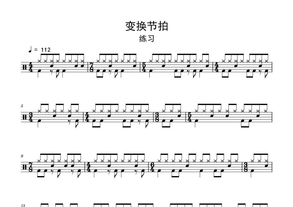 《变换节拍》是练习演唱的一首歌曲,拍号为4/4拍,歌曲速度为每分钟112拍,这份鼓谱共有一张高清图谱,图谱由 @老虎不说谎 编配上传,图谱使用五线谱编配,使用这份变换节拍架子鼓谱,你将能够轻松地敲打出这首练习的变换节拍,快来尝试吧。