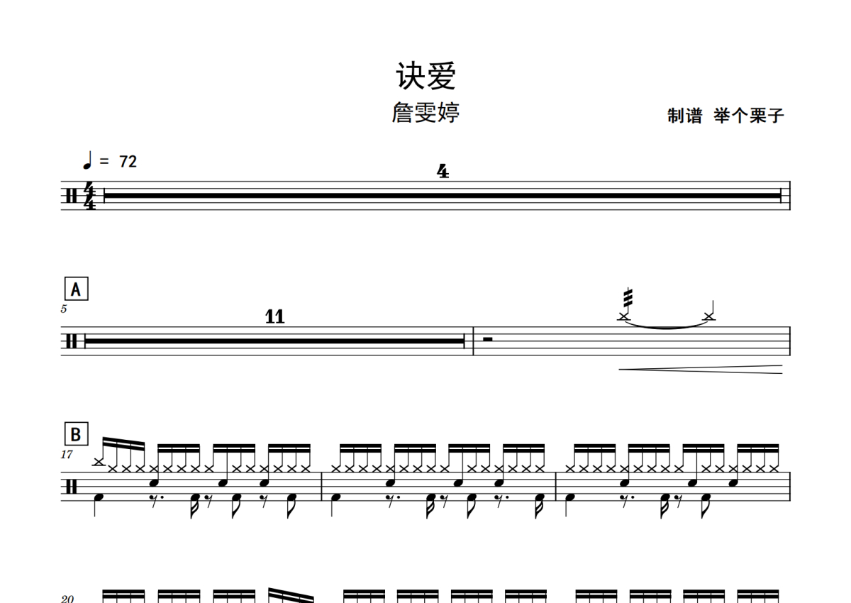 《诀爱》是詹雯婷演唱的一首歌曲,拍号为4/4拍,歌曲速度为每分钟72拍,这份鼓谱共有两张高清图谱,图谱由 @老虎不说谎 编配上传,图谱使用五线谱编配,使用这份诀爱架子鼓谱,你将能够轻松地敲打出这首詹雯婷的诀爱,快来尝试吧。