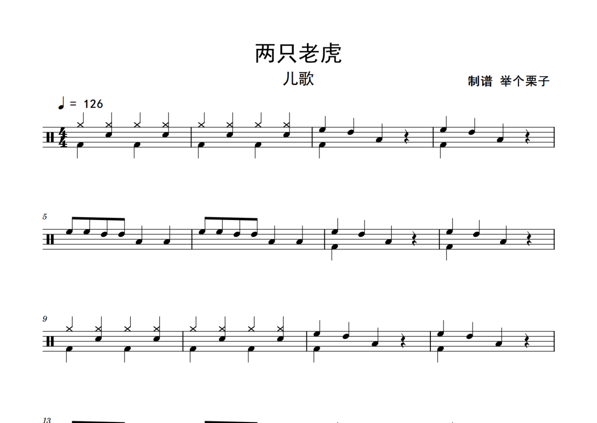 儿歌《两只老虎》鼓谱 - 架子鼓谱