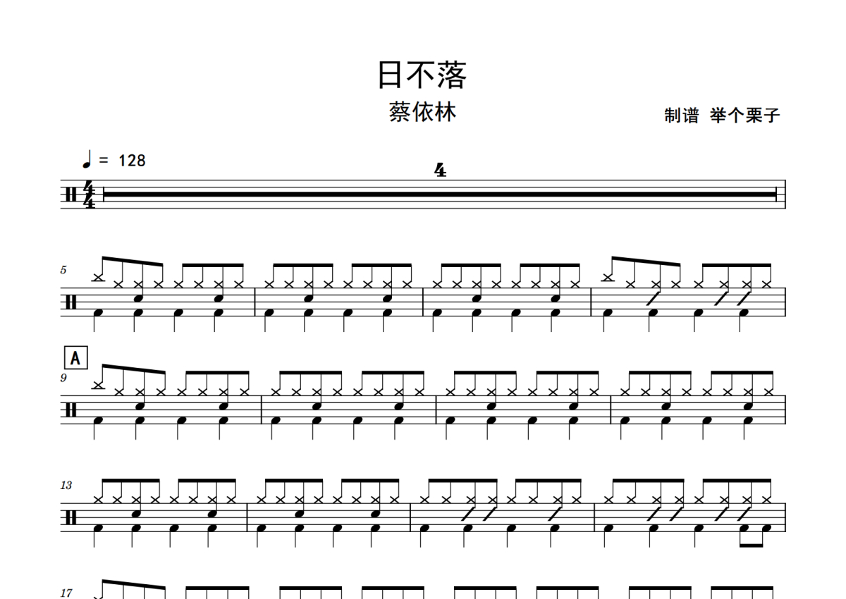 《日不落》是蔡依林演唱的一首歌曲,拍号为4/4拍,歌曲速度为每分钟128拍,这份鼓谱共有三张高清图谱,图谱由 @老虎不说谎 编配上传,图谱使用五线谱编配,使用这份日不落架子鼓谱,你将能够轻松地敲打出这首蔡依林的日不落,快来尝试吧。