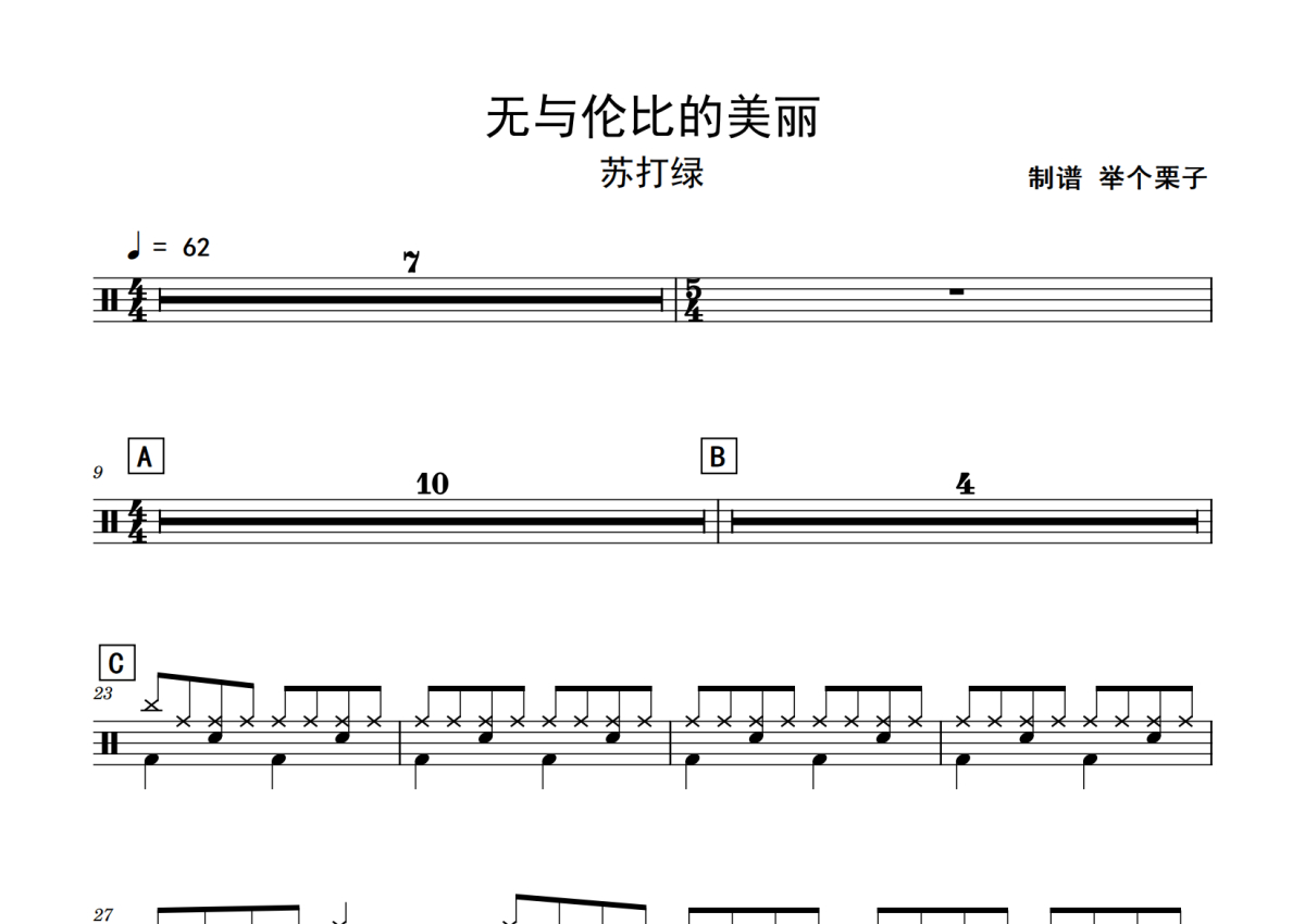 《无与伦比的美丽》是苏打绿演唱的一首歌曲,拍号为4/4拍,歌曲速度为每分钟62拍,这份鼓谱共有两张高清图谱,图谱由 @老虎不说谎 编配上传,图谱使用五线谱编配,使用这份无与伦比的美丽架子鼓谱,你将能够轻松地敲打出这首苏打绿的无与伦比的美丽,快来尝试吧。