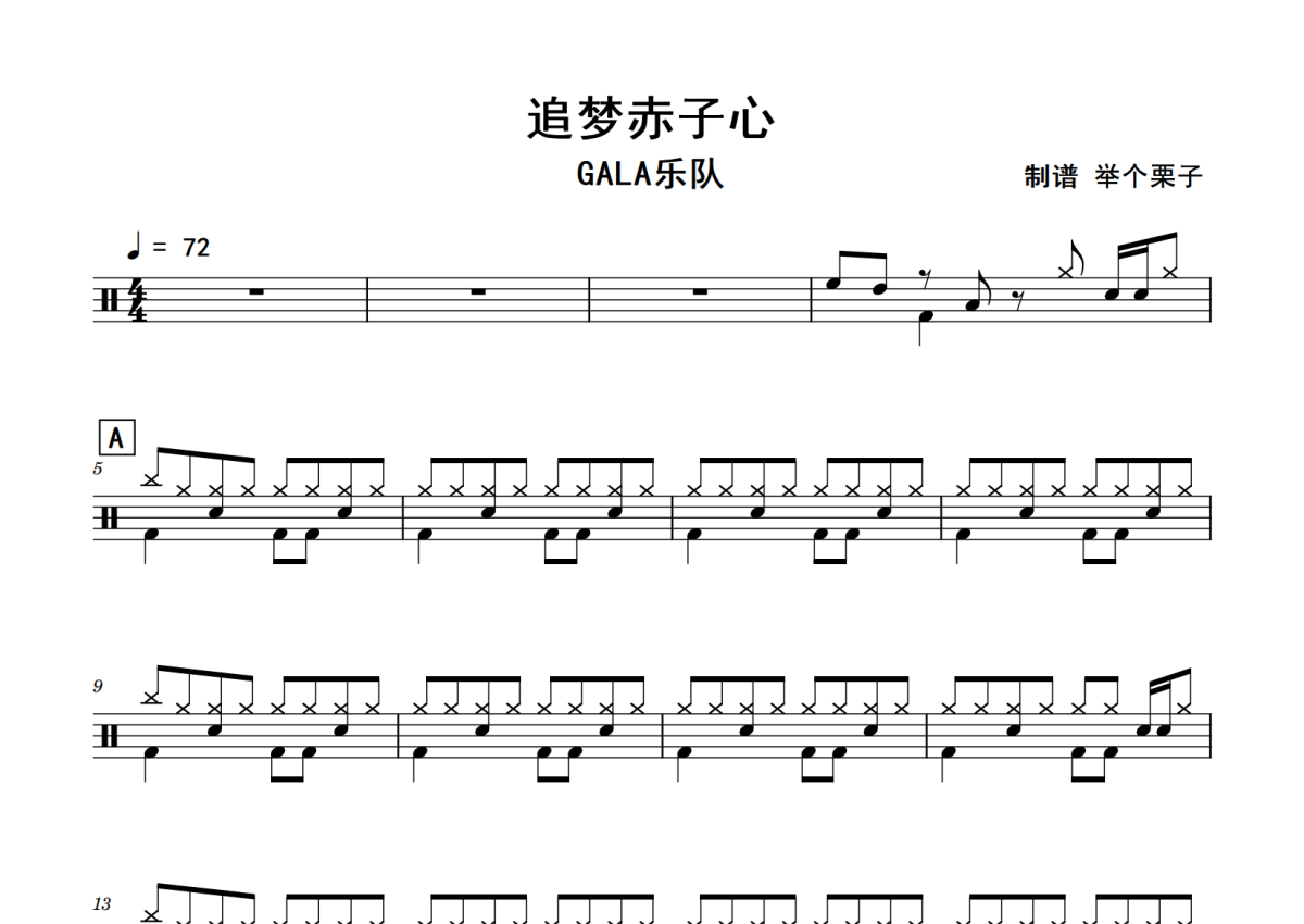 《追梦赤子心》是GALA乐队演唱的一首歌曲,拍号为4/4拍,歌曲速度为每分钟72拍,这份鼓谱共有三张高清图谱,图谱由 @老虎不说谎 编配上传,图谱使用五线谱编配,使用这份追梦赤子心架子鼓谱,你将能够轻松地敲打出这首GALA乐队的追梦赤子心,快来尝试吧。