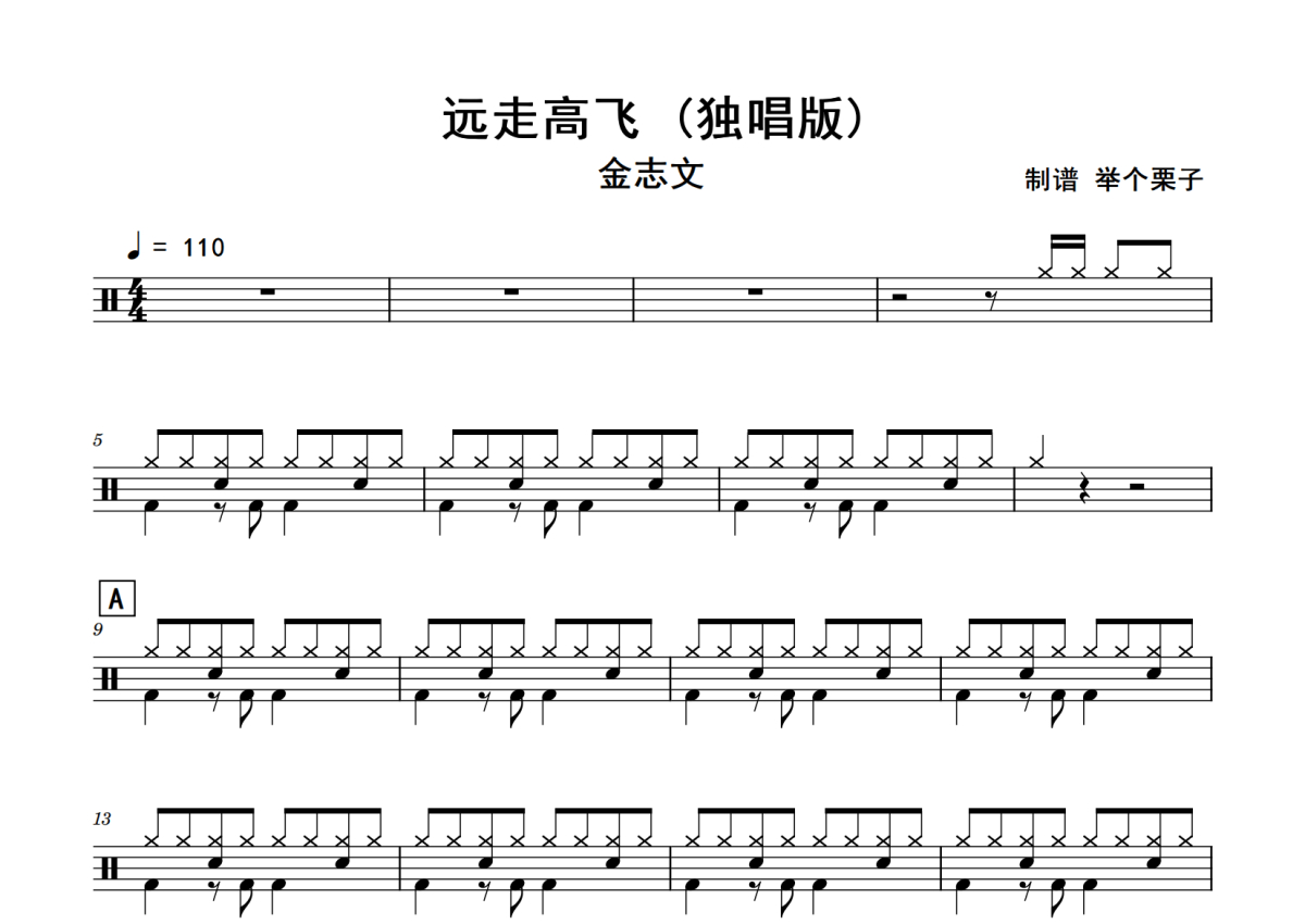 《远走高飞》是金志文演唱的一首歌曲,拍号为4/4拍,歌曲速度为每分钟110拍,这份鼓谱共有三张高清图谱,图谱由 @老虎不说谎 编配上传,图谱使用五线谱编配,使用这份远走高飞架子鼓谱,你将能够轻松地敲打出这首金志文的远走高飞,快来尝试吧。