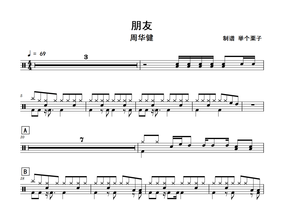 《朋友》是周华健演唱的一首歌曲,拍号为4/4拍,歌曲速度为每分钟69拍,这份鼓谱共有两张高清图谱,图谱由 @老虎不说谎 编配上传,图谱使用五线谱编配,使用这份朋友架子鼓谱,你将能够轻松地敲打出这首周华健的朋友,快来尝试吧。