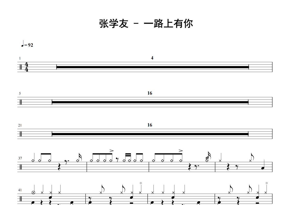 《一路上有你》是张学友演唱的一首歌曲,拍号为4/4拍,歌曲速度为每分钟92拍,这份鼓谱共有两张高清图谱,图谱由 @老虎不说谎 编配上传,图谱使用五线谱编配,使用这份一路上有你架子鼓谱,你将能够轻松地敲打出这首张学友的一路上有你,快来尝试吧。