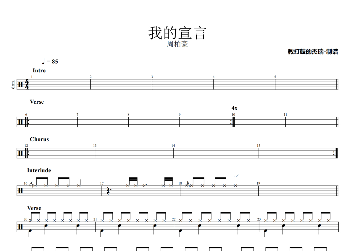 《我的宣言》是周柏豪演唱的一首歌曲,拍号为4/4拍,歌曲速度为每分钟85拍,这份鼓谱共有两张高清图谱,图谱由 @Jerry 编配上传,图谱使用五线谱编配,使用这份我的宣言架子鼓谱,你将能够轻松地敲打出这首周柏豪的我的宣言,快来尝试吧。