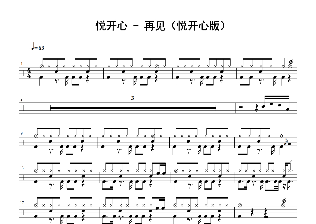 悦开心《再见》鼓谱 - 架子鼓谱 - 悦开心版