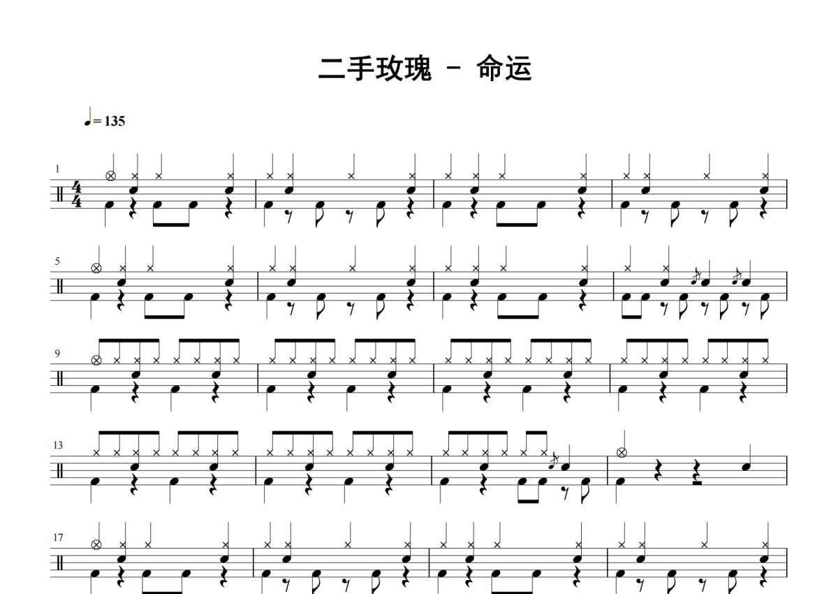《命运》是二手玫瑰演唱的一首歌曲,拍号为4/4拍,歌曲速度为每分钟135拍,这份鼓谱共有三张高清图谱,图谱由 @老虎不说谎 编配上传,图谱使用五线谱编配,使用这份命运架子鼓谱,你将能够轻松地敲打出这首二手玫瑰的命运,快来尝试吧。