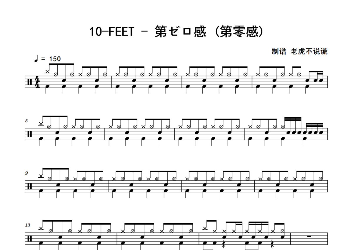 《第ゼロ感 (第零感)》是10-FEET演唱的一首歌曲,拍号为4/4拍,歌曲速度为每分钟150拍,这份鼓谱共有五张高清图谱,图谱由 @老虎不说谎 编配上传,图谱使用五线谱编配,使用这份第ゼロ感 (第零感)架子鼓谱,你将能够轻松地敲打出这首10-FEET的第ゼロ感 (第零感),快来尝试吧。