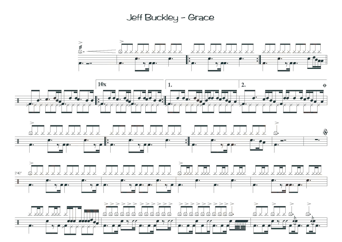 《Grace》是Jeff Buckley演唱的一首歌曲,这份鼓谱共有两张高清图谱,图谱由 @打鼓谱 编配上传,图谱使用五线谱编配,使用这份Grace架子鼓谱,你将能够轻松地敲打出这首Jeff Buckley的Grace,快来尝试吧。Grace是由美国歌手兼歌手Jeff Buckley于1994年8月23日由Columbia Records发行的第一张也是唯一的录音室专辑。该专辑最初销量不佳,收到的评论不一。但是,近年来,它的重要声誉得到了显着提高。庆祝发行十周年的专辑的扩展版本(称为“旧版”)于2004年8月23日发行,在英国排名第44位。