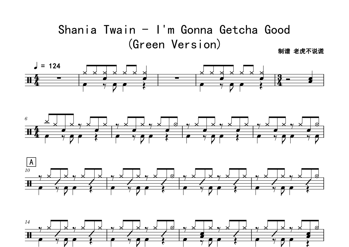 《I'm Gonna Getcha Good (Green Version)》是Shania Twain演唱的一首歌曲,歌曲速度为每分钟124拍,这份鼓谱共有四张高清图谱,图谱由 @老虎不说谎 编配上传,图谱使用五线谱编配,使用这份I'm Gonna Getcha Good (Green Version)架子鼓谱,你将能够轻松地敲打出这首Shania Twain的I'm Gonna Getcha Good (Green Version),快来尝试吧。