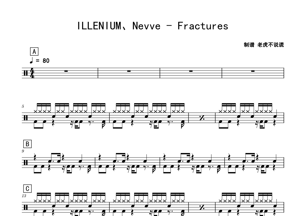 《Fractures》是ILLENIUM、Nevve演唱的一首歌曲,拍号为4/4拍,歌曲速度为每分钟80拍,这份鼓谱共有两张高清图谱,图谱由 @老虎不说谎 编配上传,图谱使用五线谱编配,使用这份Fractures架子鼓谱,你将能够轻松地敲打出这首ILLENIUM、Nevve的Fractures,快来尝试吧。