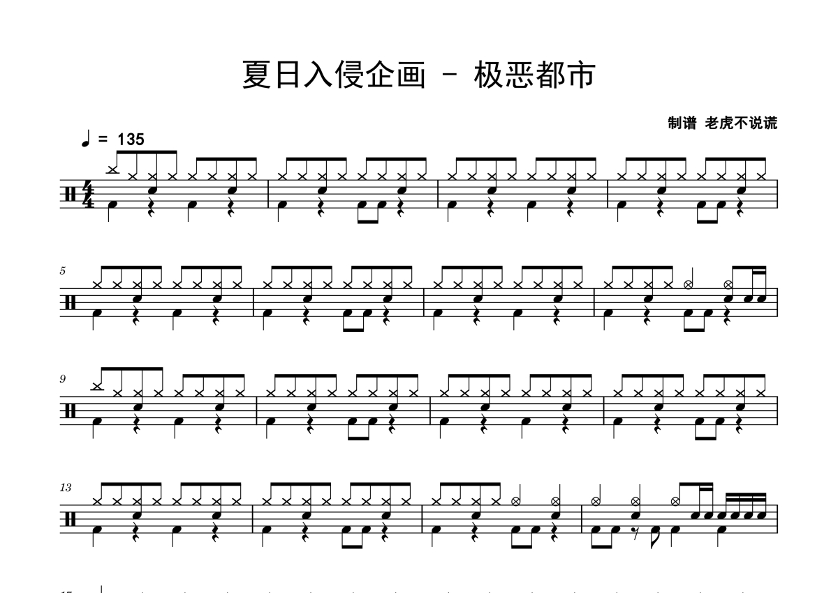 《极恶都市》是夏日入侵企画演唱的一首歌曲,拍号为4/4拍,歌曲速度为每分钟135拍,这份鼓谱共有四张高清图谱,图谱由 @老虎不说谎 编配上传,图谱使用五线谱编配,使用这份极恶都市架子鼓谱,你将能够轻松地敲打出这首夏日入侵企画的极恶都市,快来尝试吧。