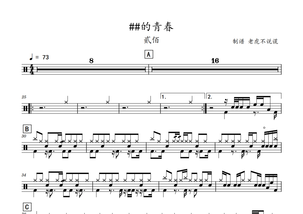 贰佰《狗日的青春》鼓谱 - 架子鼓谱