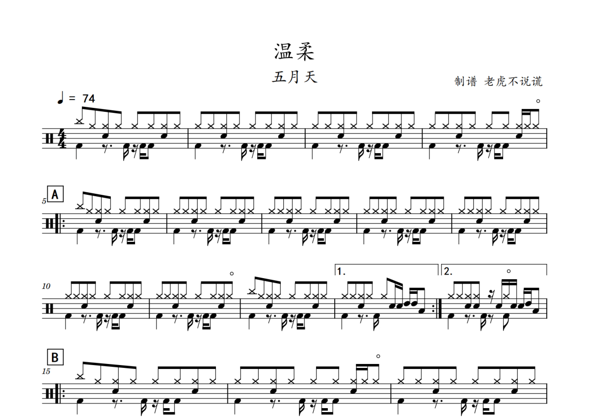 《温柔》是五月天演唱的一首歌曲,拍号为4/4拍,歌曲速度为每分钟74拍,这份鼓谱共有两张高清图谱,图谱由 @老虎不说谎 编配上传,图谱使用五线谱编配,使用这份温柔架子鼓谱,你将能够轻松地敲打出这首五月天的温柔,快来尝试吧。