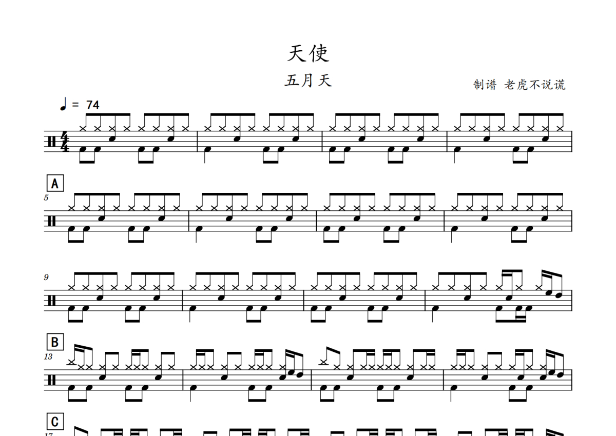 《天使》是五月天演唱的一首歌曲,拍号为4/4拍,歌曲速度为每分钟74拍,这份鼓谱共有两张高清图谱,图谱由 @老虎不说谎 编配上传,图谱使用五线谱编配,使用这份天使架子鼓谱,你将能够轻松地敲打出这首五月天的天使,快来尝试吧。