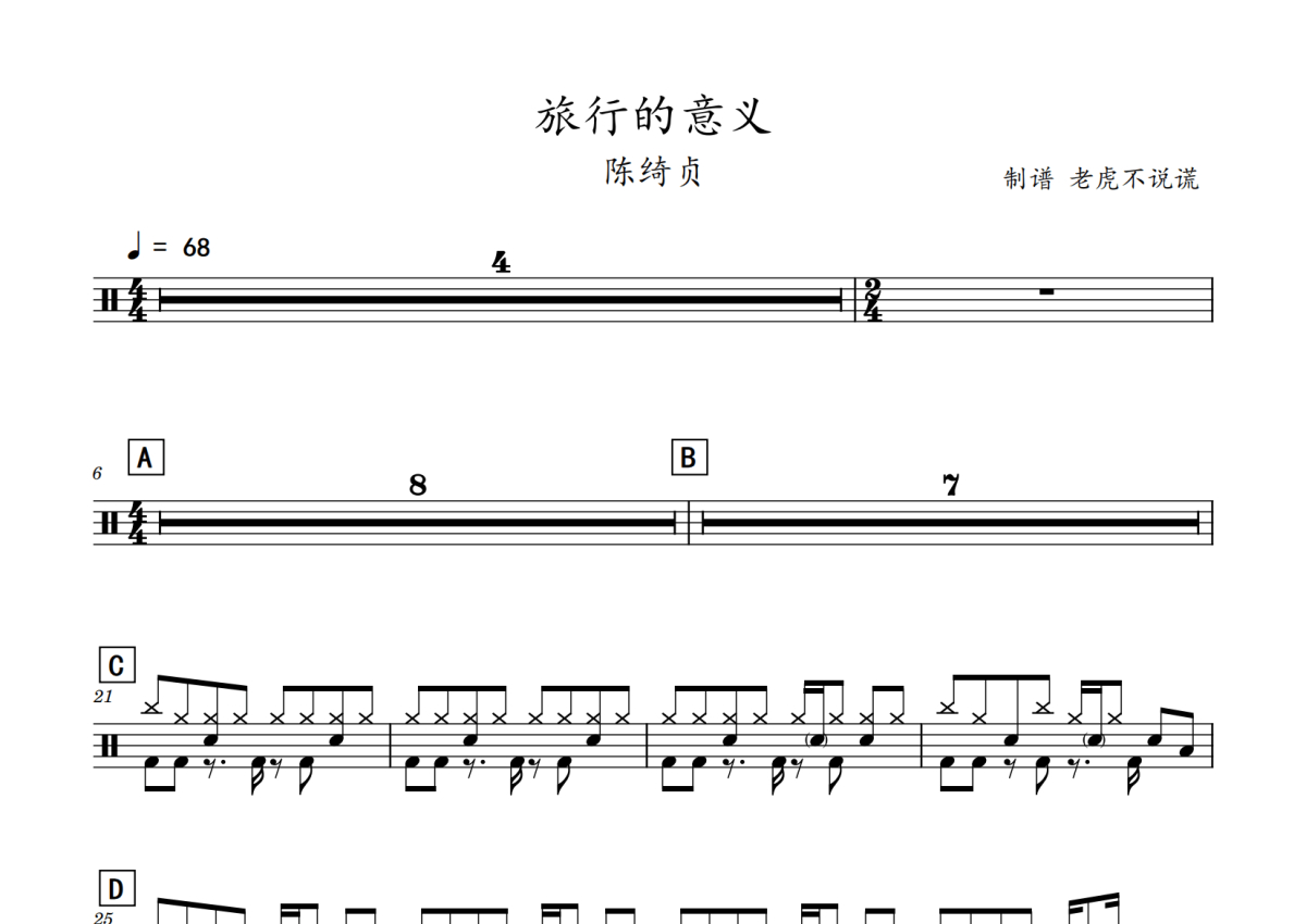 《旅行的意义》是陈绮贞演唱的一首歌曲,拍号为4/4拍,歌曲速度为每分钟68拍,这份鼓谱共有两张高清图谱,图谱由 @老虎不说谎 编配上传,图谱使用五线谱编配,使用这份旅行的意义架子鼓谱,你将能够轻松地敲打出这首陈绮贞的旅行的意义,快来尝试吧。