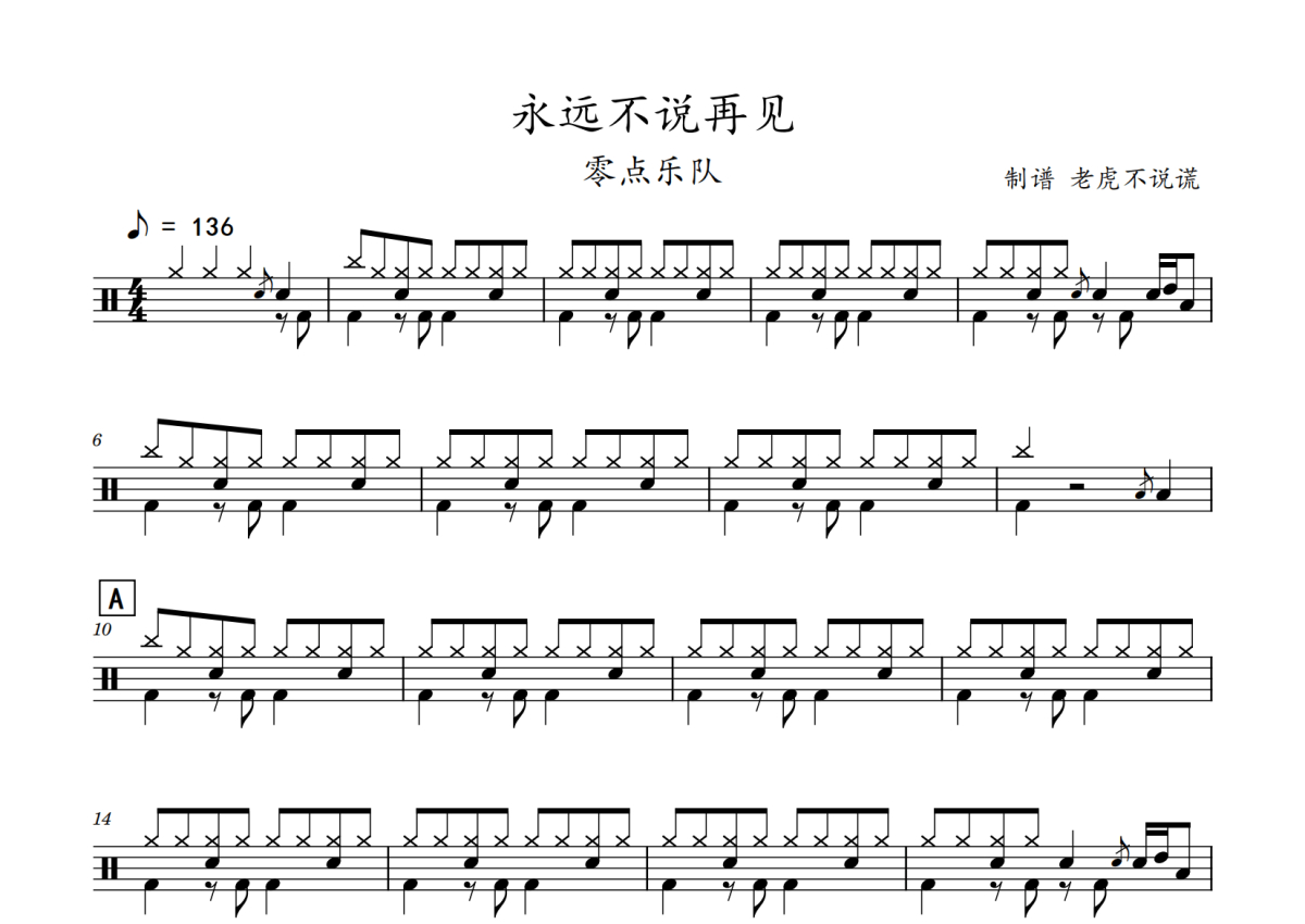 《永远不说再见》是零点乐队演唱的一首歌曲,拍号为4/4拍,歌曲速度为每分钟136拍,这份鼓谱共有两张高清图谱,图谱由 @老虎不说谎 编配上传,图谱使用五线谱编配,使用这份永远不说再见架子鼓谱,你将能够轻松地敲打出这首零点乐队的永远不说再见,快来尝试吧。
