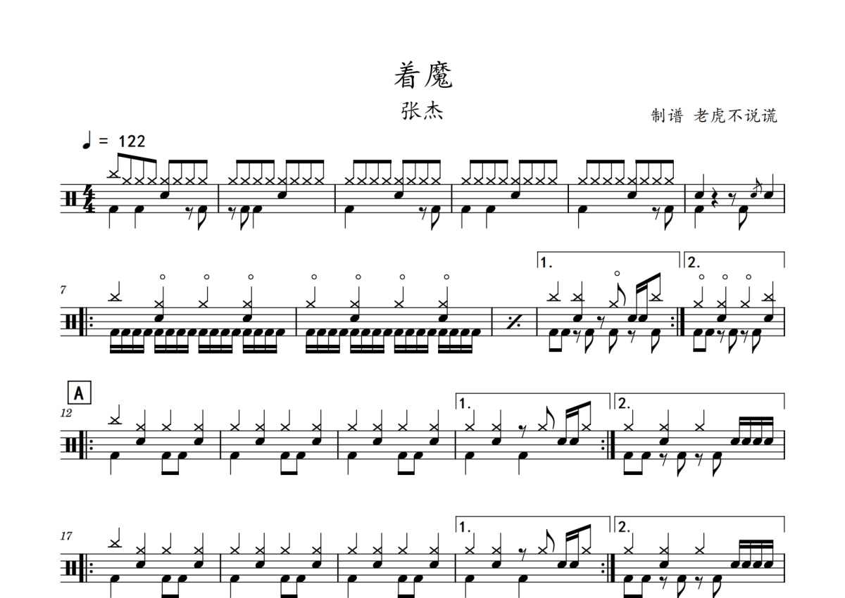 《着魔》是张杰演唱的一首歌曲,拍号为4/4拍,歌曲速度为每分钟122拍,这份鼓谱共有两张高清图谱,图谱由 @老虎不说谎 编配上传,图谱使用五线谱编配,使用这份着魔架子鼓谱,你将能够轻松地敲打出这首张杰的着魔,快来尝试吧。