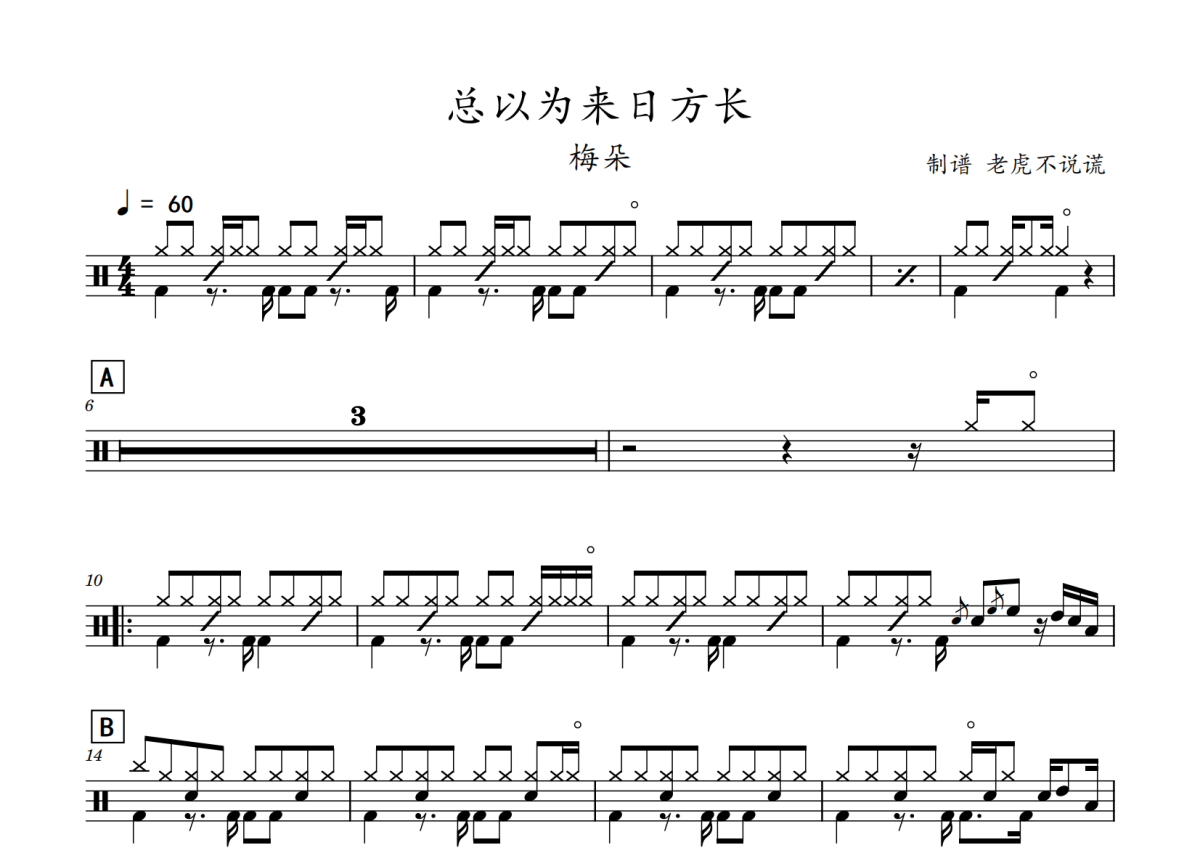 《总以为来日方长》是梅朵演唱的一首歌曲,拍号为4/4拍,歌曲速度为每分钟60拍,这份鼓谱共有一张高清图谱,图谱由 @老虎不说谎 编配上传,图谱使用五线谱编配,使用这份总以为来日方长架子鼓谱,你将能够轻松地敲打出这首梅朵的总以为来日方长,快来尝试吧。