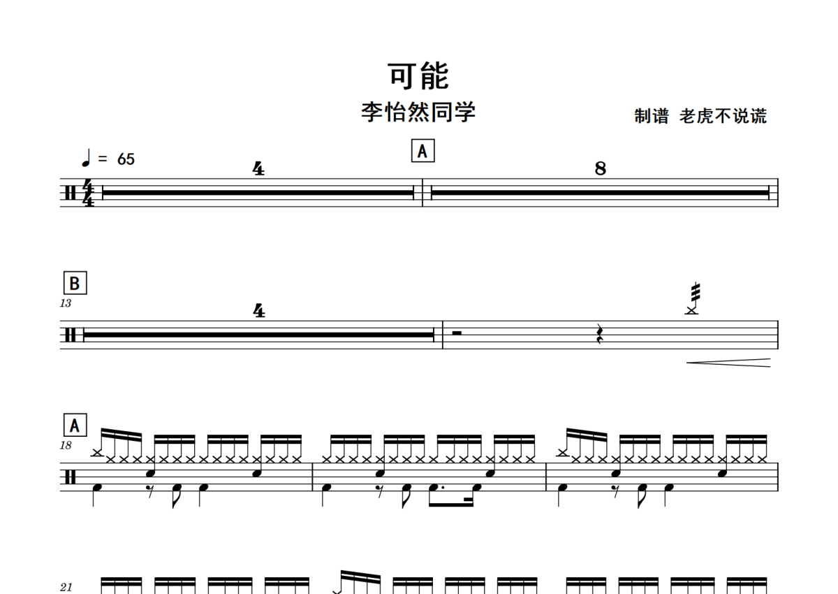 《可能》是李怡然同学演唱的一首歌曲,拍号为4/4拍,歌曲速度为每分钟65拍,这份鼓谱共有两张高清图谱,图谱由 @老虎不说谎 编配上传,图谱使用五线谱编配,使用这份可能架子鼓谱,你将能够轻松地敲打出这首李怡然同学的可能,快来尝试吧。