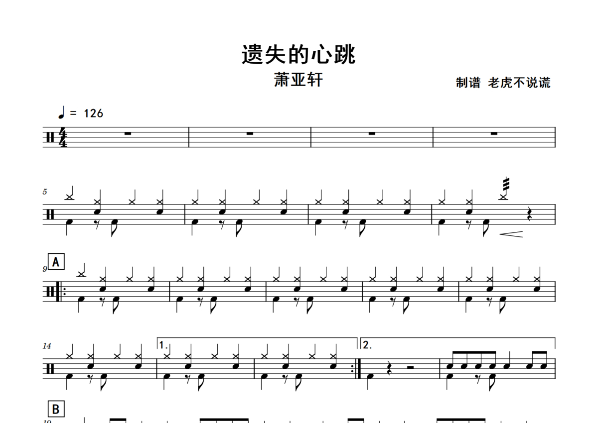 《遗失的心跳》是萧亚轩演唱的一首歌曲,拍号为4/4拍,歌曲速度为每分钟126拍,这份鼓谱共有两张高清图谱,图谱由 @老虎不说谎 编配上传,图谱使用五线谱编配,使用这份遗失的心跳架子鼓谱,你将能够轻松地敲打出这首萧亚轩的遗失的心跳,快来尝试吧。