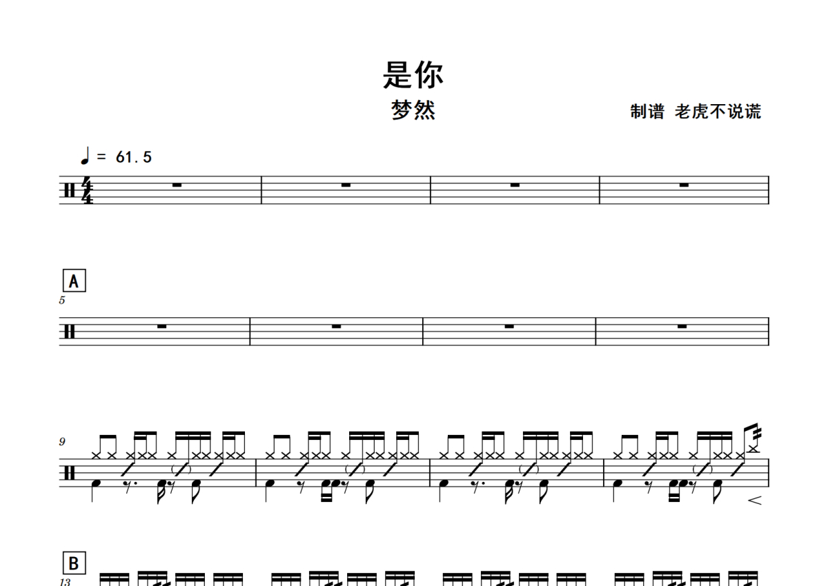 《是你》是梦然演唱的一首歌曲,拍号为4/4拍,歌曲速度为每分钟61拍,这份鼓谱共有两张高清图谱,图谱由 @老虎不说谎 编配上传,图谱使用五线谱编配,使用这份是你架子鼓谱,你将能够轻松地敲打出这首梦然的是你,快来尝试吧。