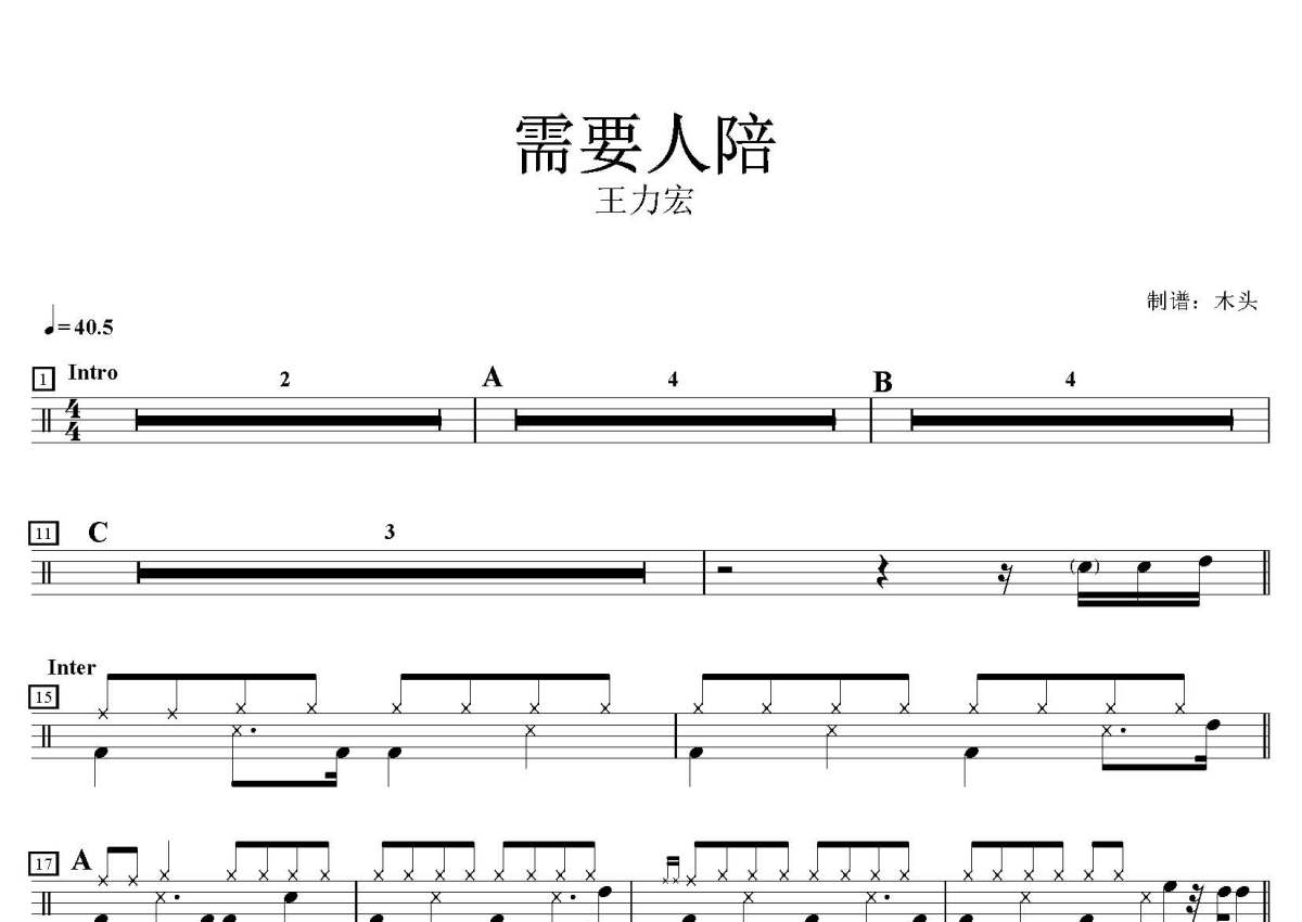 王力宏《需要人陪》鼓谱 - 架子鼓谱