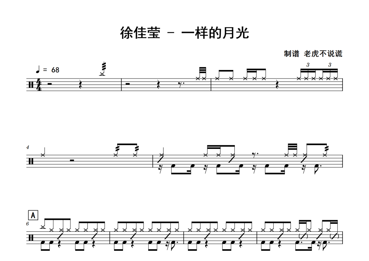 《一样的月光》是徐佳莹演唱的一首歌曲,拍号为4/4拍,歌曲速度为每分钟68拍,这份鼓谱共有三张高清图谱,图谱由 @老虎不说谎 编配上传,图谱使用五线谱编配,使用这份一样的月光架子鼓谱,你将能够轻松地敲打出这首徐佳莹的一样的月光,快来尝试吧。