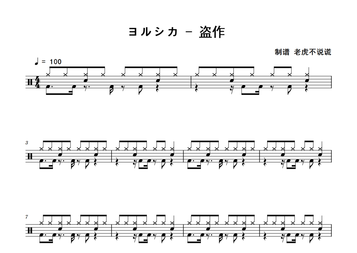 《盗作》是ヨルシカ演唱的一首歌曲,拍号为4/4拍,歌曲速度为每分钟100拍,这份鼓谱共有四张高清图谱,图谱由 @老虎不说谎 编配上传,图谱使用五线谱编配,使用这份盗作架子鼓谱,你将能够轻松地敲打出这首ヨルシカ的盗作,快来尝试吧。