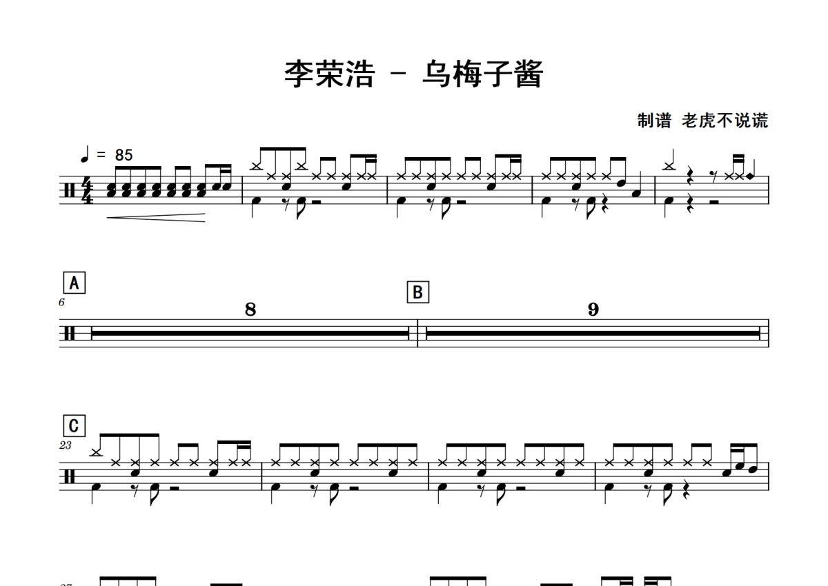 《乌梅子酱》是李荣浩演唱的一首歌曲,拍号为4/4拍,歌曲速度为每分钟85拍,这份鼓谱共有两张高清图谱,图谱由 @老虎不说谎 编配上传,图谱使用五线谱编配,使用这份乌梅子酱架子鼓谱,你将能够轻松地敲打出这首李荣浩的乌梅子酱,快来尝试吧。