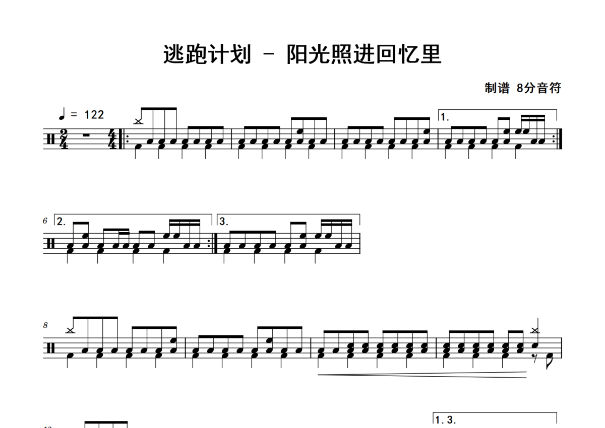 《阳光照进回忆里》是逃跑计划演唱的一首歌曲,拍号为2/4拍,歌曲速度为每分钟122拍,这份鼓谱共有四张高清图谱,图谱由 @老虎不说谎 编配上传,图谱使用五线谱编配,使用这份阳光照进回忆里架子鼓谱,你将能够轻松地敲打出这首逃跑计划的阳光照进回忆里,快来尝试吧。