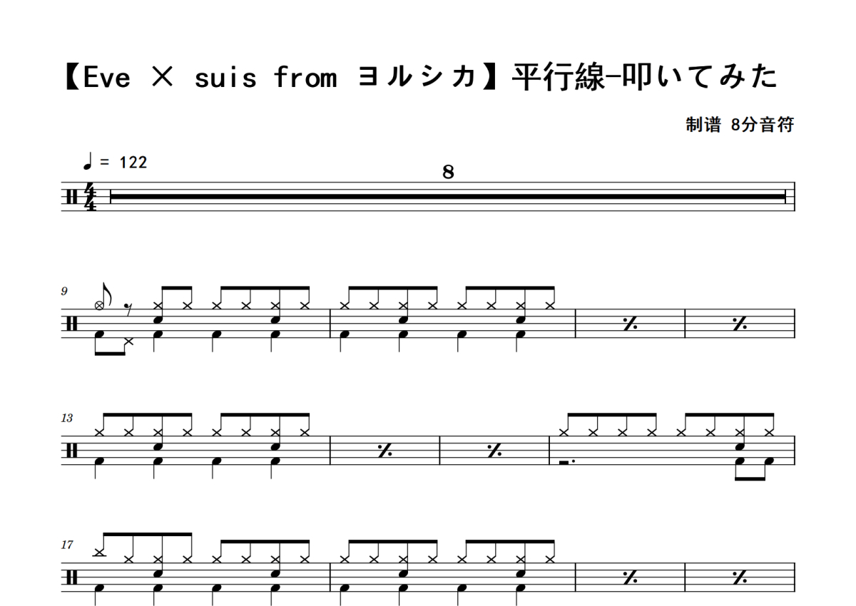 《平行線-叩いてみた》是【Eve × suis from ヨルシカ】演唱的一首歌曲,拍号为4/4拍,歌曲速度为每分钟122拍,这份鼓谱共有三张高清图谱,图谱由 @老虎不说谎 编配上传,图谱使用五线谱编配,使用这份平行線-叩いてみた架子鼓谱,你将能够轻松地敲打出这首【Eve × suis from ヨルシカ】的平行線-叩いてみた,快来尝试吧。